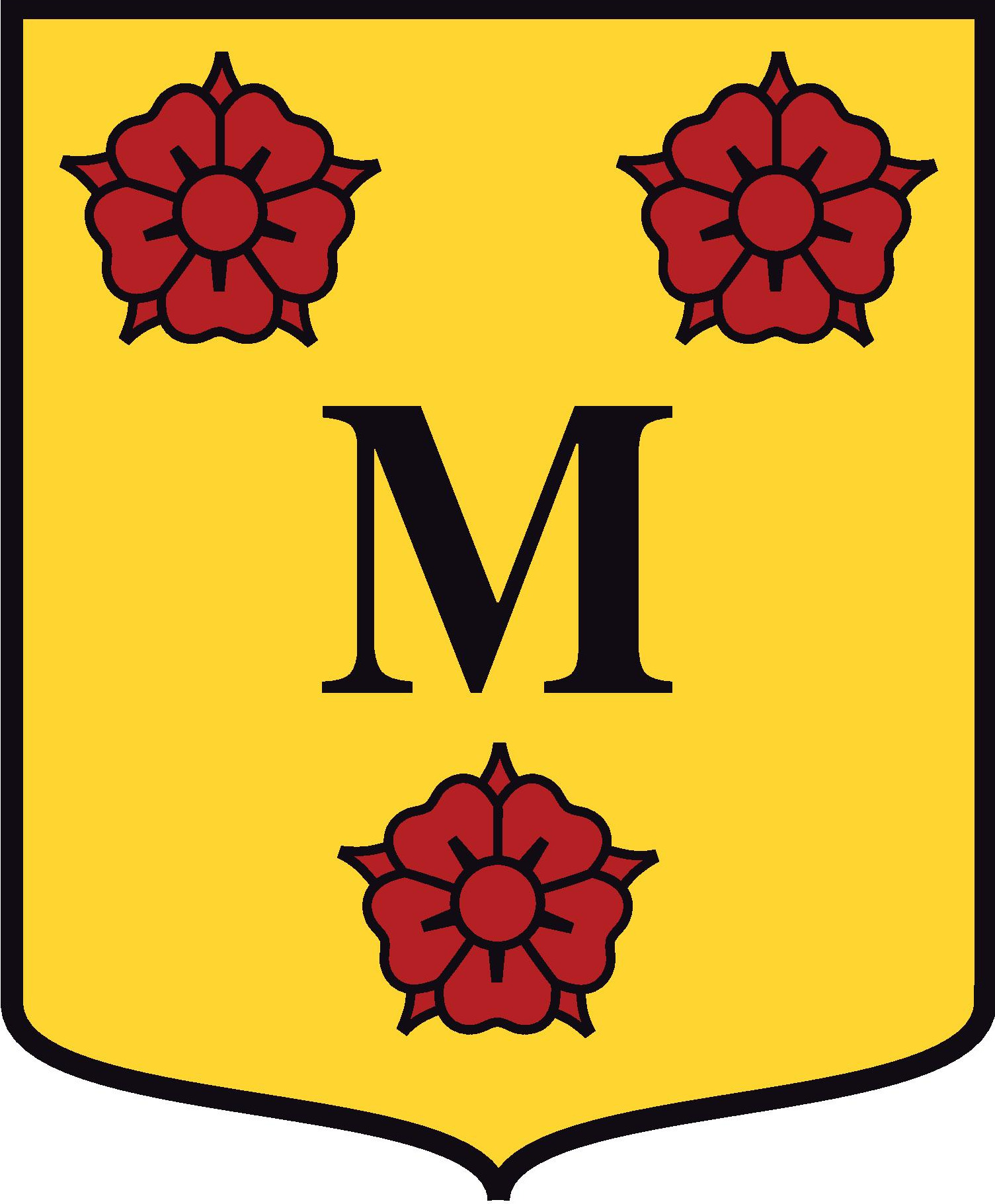 D’or à la lettre M de sable posée en cœur et trois roses de gueules posées deux en chef et une en pointe.